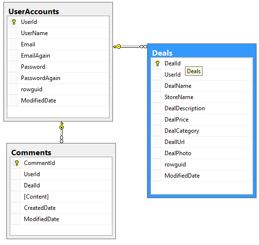 The database includes three main tables: User Account, deal, comment. They connected by foreign key constrains to prevent unexpected inputs. The database diagram is shown below: