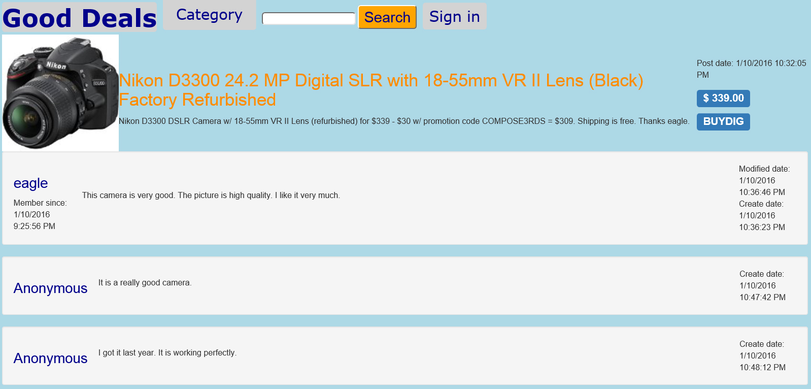 The online deal collection demo was designed using MVC 5 (C#.net) and SQL Server. It has basic functions for deal collection, such as make comments, link to the deal website, sign in, category, search, load and edit deal as an administrator, and send email to users for registration. The most important one is that registered user can only leave one comment for each deal. They can easily modify their comments. The unregisted users can only leave a comment, they cannot modify their commnets.