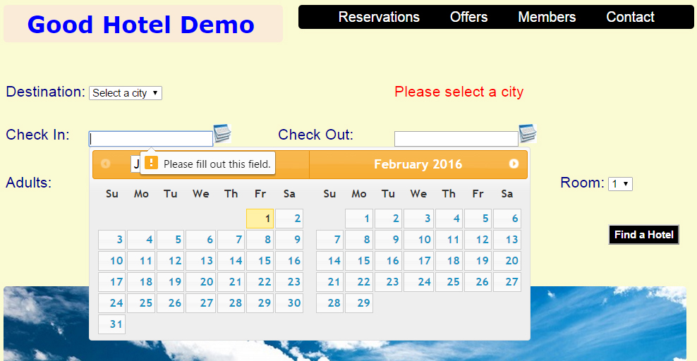 The online hotel booking demos was desgined using Web Form (C#.net) and SQL Server. It has basic functions for online booking, such as select check in and out dates, city and hotel room, input personal information and credit card, send an email to customers for the order information when they successfully submit the orders, check booking information. There are a lot of validations for this booking system. The most important one is that it only allows customers to input current date or later than the current date in the checkin box, and to input the date later than the checkin date in the checkout box. It only allows the special date formate in the input box and it actually encourage people to use the calendar selector. Other main validations include the diabled button when room is 0, must check the check box to enable the submit order button, a lot of validations for input boxes and dropdown lists etc.